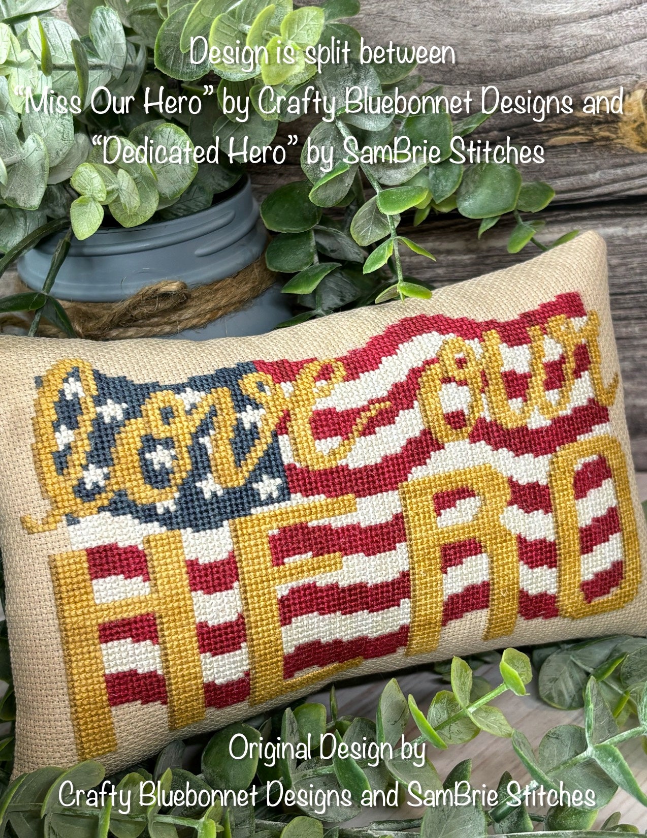 "Miss Our Hero" is an original design by Crafty Bluebonnet Designs. This is in collaboration with Becca Murphy of SamBrie Stitches and includes a part of the "Love Our Hero" design. PLEASE NOTE THAT YOU WILL NEED TO PURCHASE "MISS OUR HERO" BY CRAFTY BLUEBONNET DESIGNS AND "DEDICATED HERO" BY SAMBRIE STITCHES TO HAVE THE COMPLETE CHART FOR STITCHING "LOVE OUR HERO". "LOVE OUR HERO" IS NOT SOLD INDIVIDUALLY AND ONLY COLOR CHART IS PROVIDED.